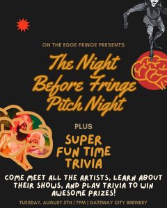 This year we decided to combine our love for trivia and our love for fringe and create a Fringe Pitch & Trivia Night to kick off the festival in style! Join us at 7 pm at Gateway City Brewery on Tuesday, August 5th to grab a bevvy, hear about the shows coming to our festival this season from the artists themselves, and to test your fringey knowledge in a game of trivia hosted by Super Fun Time Trivia.
