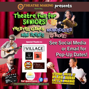 Please join Theatre Making North Bay as they present a play reading for seniors as part of this year’s Fringe festival. This drop-in event is open to everyone and no experience or registration is required. There will also be some light refreshments provided, including cornbread from Chicken Kitchen, as well as coffee from Hades Coffee!
